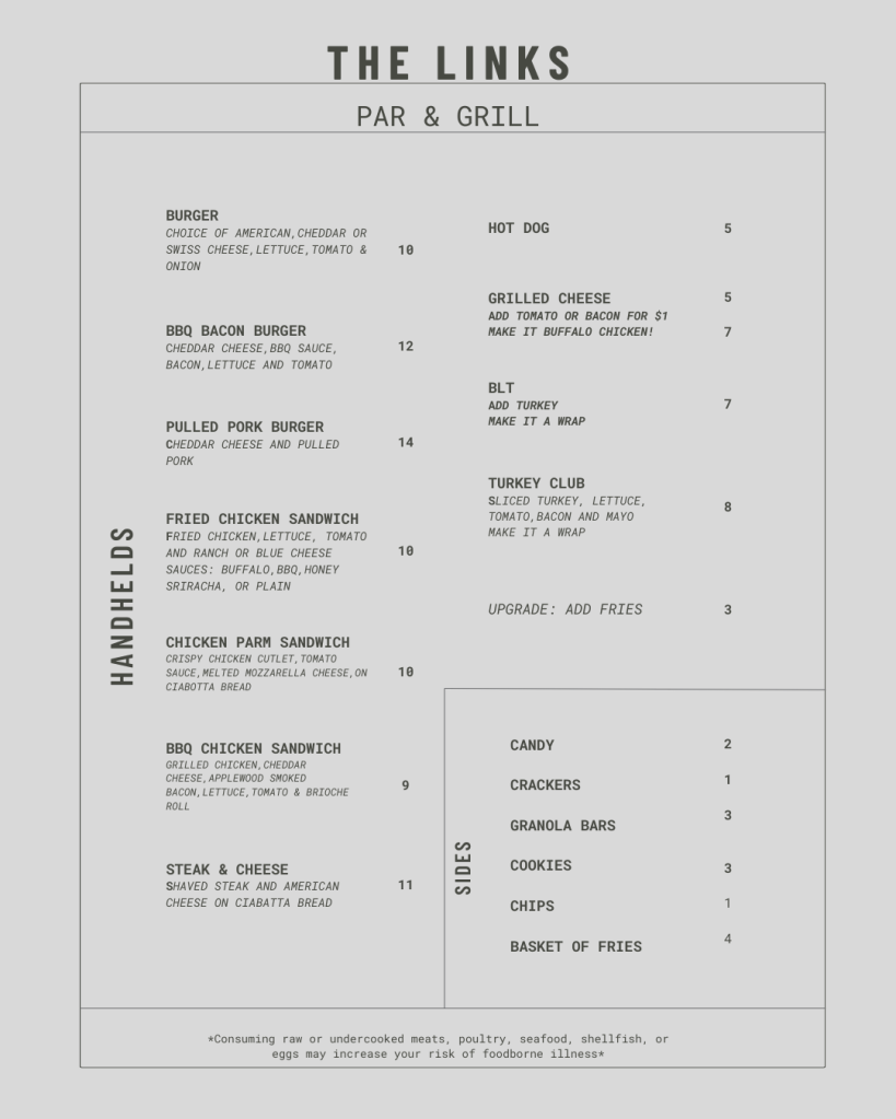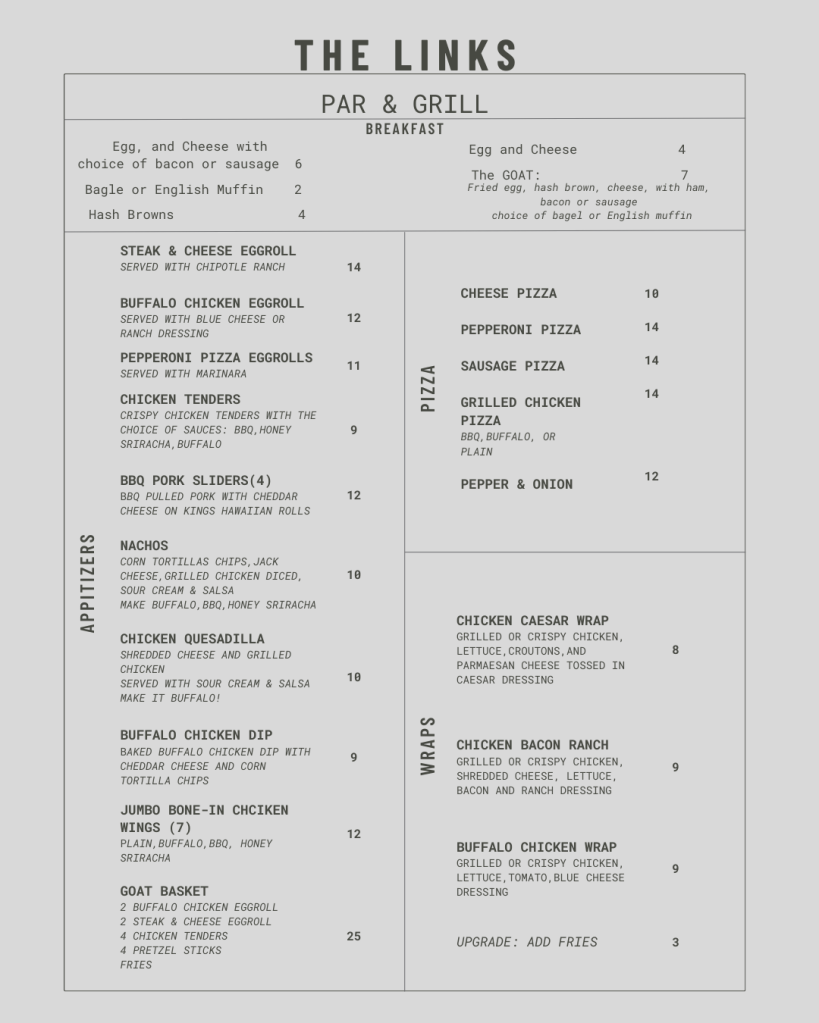 The Links Café Wide variety of appetizers, sandwiches, wraps and specialty menu items. Visit the Shack at the turn to grab a drink and bite to eat on the go. Menus The Shack at The Turn For Function Information Email mbonanno@braintreema.gov